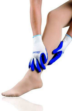 Medizinische Kompressionsstrümpfe haben sich als Therapiestandard bei Venenleiden bewährt und werden in der entsprechenden Kompressionsklasse vom Arzt verordnet. Mit ihrem genau definierten Druckverlauf unterstützen sie den venösen Rückfluss und reduzieren dadurch Schwellungen und schmerzhafte Flüssigkeitsstauungen. Voraussetzung dafür ist der richtige Sitz der Strümpfe am Bein, damit der Kompressionsdruck an der erforderlichen Stelle und in der gewünschten Stärke wirkt. Mit den neuen grip-Star Handschuhen der Firma Belsana gibt es jetzt eine Anziehhilfe, die dank der griffigen Oberflächenstruktur einen sicheren Griff erlaubt und zugleich das Gestrick vor ungewollten äußeren Einflüssen, beispielsweise durch Schmuck oder Fingernägel, schützt.